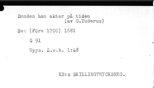//// Bonden han aktar på tiden //// (av G.Tuderus) //// Se: (Före 1700) 1681 //// G 91 //// Upps. Z.u.h. 1:4^ //// j //// t //// //// /KB:s SKILLINGTRYCKSREG. ////