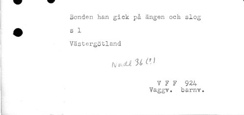 //// j Bonden han gick på ängen och slog //// Västergötland //// - //// ! //// j //// V F F 924 //// ! Vaggv. barnv. ////