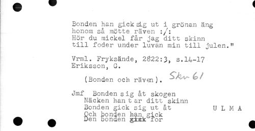 //// Bonden han gick sig ut i grönan äng //// honom så mötte räven :/: //// Hör du mickel får jag ditt skinn //// till foder under luvan min till julen." //// Vrml. Fryksände, 2322:3, s.14-17 //// Eriksson, G. //// (Bonden och rävm). ' //// Jmf Bonden s ig åt skogen //// Näcken han t ar ditt skinn //// Bonden gick sig ut åt U L M A //// Och bonden han gick //// ^ ^ Den bonden giak for ^ ////