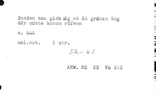 //// Bonden han gick sLg ut åt grSnan äng //// där mötte honom räfven //// s. 444 //// < //// mel.not. 1 str. 5 //// S //// / r //// ! //// ARW. MS KB Vs 2:2 ] ////