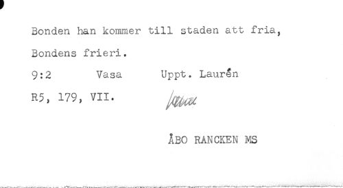 //// Bonden han kommer till staden att fria, //// Bondens frieri. //// 9:2 Vasa Uppt. Laurån //// R5, 179, VII. ^ //// ÅBO RANCKEN MS ////