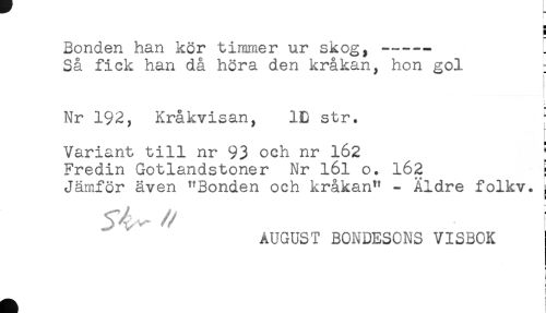 //// Bonden han kör timmer ur skog, ----- //// Så fick han då höra den kråkan, hon gol ; //// Nr 192, Kråkvisan, ID str. ^ //// Variant till nr 93 och nr 162 ' //// Fredin Gotlandstoner Nr 161 o. 162 i //// $ + //// Jämför även "Bonden och kråkan" - Äldre folkv. ; //// H //// - ^ i //// AUGUST BONDESONS VISBOK //// f ////
