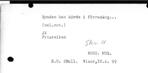 //// Bonden han körde i förruskog... //// (mel.not.) //// Jä //// Frostviken //// NORD. MUS. //// ^ E.U. 20411. Visor,IV.s. 99 ////