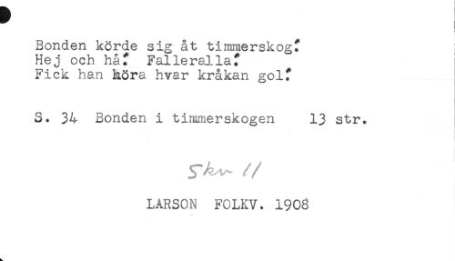 //// Bonden körde sig åt timmerskogt //// Hej och håf Fallerallaf i //// Fick han höra hvar kråkan golf //// S. 34 Bonden i timmerskogen 13 str. //// - //// yA^ //// //LARSON FOLKV. 190g ////