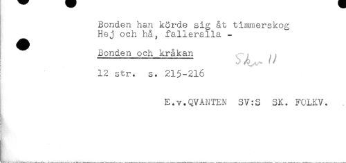 //// Bonden han körde sig åt timmerskog //// Hej och ha, falleralla - //// Bonden och kråkan i * i //// 12 str. s. 215-216 //// . //// E.v.QVANTEN SV:S SK. FOLKV. ////