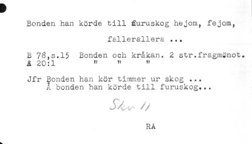 //// Bonden han körde till furuskog hejom, fejom, //// fallerallera ..* //// B 7^,s.l5 Bonden och kråkan. 2 str.fragm$not. //// Å 20:1 " " " //// Jfr Bonden han kör timmer ur skog ... //// A bonden han körde till furuskog... //// RÅ ////