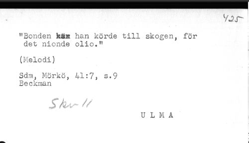 //// V jr //// + //// "Bonden hän han körde till skogen, för //// det nionde olio." //// (Melodi) //// t ! //// Sdm, Mörkö, 41:7, s.9 ! //// Beckman //// //// //U L M A ////