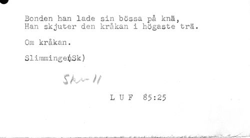 //// Sonden han lade sin bössa på knä, //// Han skjuter den kråkan i högaste trä. //// Om kråkan. //// Slimminge^Sk) //// L U F 85:25 ////