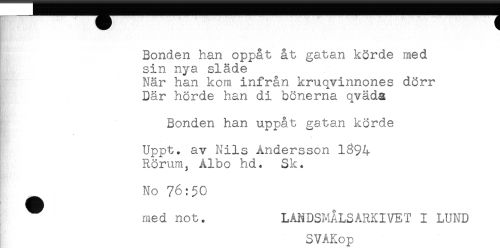 //// Bonden han oppåt åt gatan körde med //// sin nya släde //// När han kom infrån kruqvinnones dörr //// Där hörde han di bönerna qväda //// Bonden han uppåt gatan körde //// * //// * //// Uppt. av Nils Andersson 1^94 //// Rörum, Albo hd. Sk. //// No 76:50 //// med not. LANDSMÅLSARKIVET I LUND //// SVAKop ////