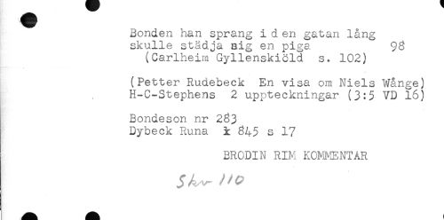 //// Bonden han sprang i d en gatan lång //// skulle städja nig en piga //// (Carlheim Gyllenskiöld s. 102) //// (Petter Rudebeck En visa om Niels Wånge) //// H-C-Stephens 2 uppteckningar (3:5 VD 16) //// Bondeson nr 2^3 //// Dybeck Runa 3c 345 s 17 //// BRODIN RIM KOMMENTAR ////