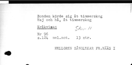 //// ! //// . ^' . - - * //// Bonden körde sig åt timmerskog //// Hej och hå, åt timmerskog //// Kråkvisan //// //Nr 96 //// s.124 mel.not. 13 str. //// HELLGREN SÅNGLEKAR FR.NÄÄS I ////