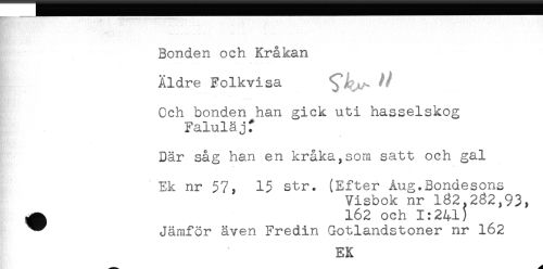 //// Bonden och Kråkan //// Äldre Folkvisa ^ //// Och bonden han gick uti hasselskog //// Faluläjf //// Där såg han en kråka,som satt och gal //// Ek nr 57, 15 str. (Efter Åug.Bondesons //// Visbok nr 132,232,93, //// ^ 162 och 1:241) //// ^ Jämför även Fredin Gotlandstoner nr 162 //// EK ////