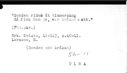 //// "Bonden rideip åt timmerskog //// då fick han se, var kråkan satt." //// (Fon.skr.) //// Nrk. Knista, 41:147, s.40-41. //// Larsson, R. //// (Bonden och kråkan) //// U L M A //// i //// ^ H ////