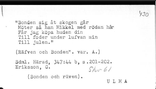 //// ! ^ //// "Bonden sig åt skogen går //// Möter så han Mikkel med rödan hår //// Får jag köpa huden din //// Till foder under lufvan min //// Till julen." //// (Räfven och Bonden'', var. Å.) //// Sdml. Härad, 347:44 b, s.201-202. //// Eriksson, G. //// (Bonden och räven). //// ULMA ////