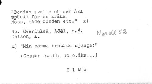 //// "Bonden skulle ut och åka //// wpände för en kråka, //// Hopp, sade bonden etc." x) //// Nb. Överluleå, 43$1, s.3. hf^Ji^t //// Ohlson, A. ^ ^^ //// x) "Min manma brukade sjunga:" //// (Gossen skulle ut o.åka...) //// U L M Å ////