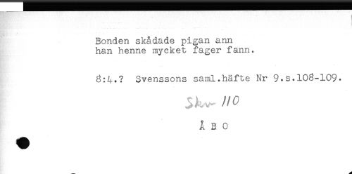 //// Bonden skådade pigan ann //// han henne mycket fager fann. //// 8:4.? Svenssons saml.häfte Nr 9.s.108-109. //// ÅBO ////