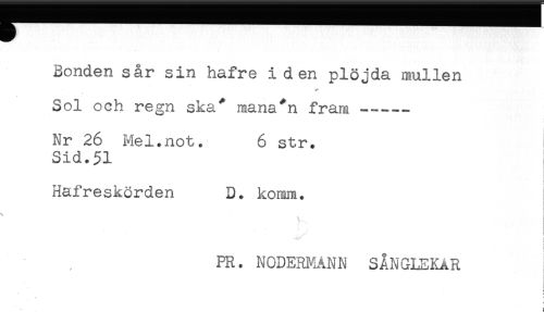 //// Bonden sår sin hafre iden plöjda mullen //// v //// Sol och regn ska" mana*n fram ----- //// Nr 26 Mel.not. 6 str. //// Sid.51 //// i //// Hafreskörden D. komm. //// ! //// i //// ! //// PR. NCDERMÅNN SÅNGLEKAR //// t //// L //// s i ////