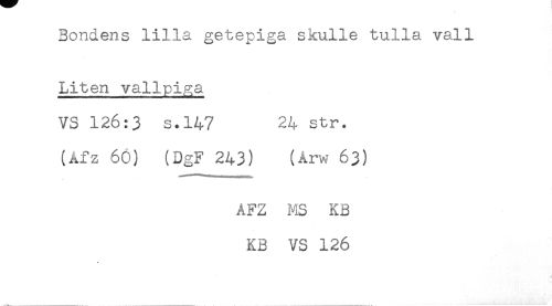 //// Bondens lilla getepiga skulle tulla vall //// Liten vallpiga //// VS 126:3 s.147 24 str. //// (Åfz 60) (DgF 243) (Arw 63) //// AFZ MS KB //// KB VS 126 //// * ////