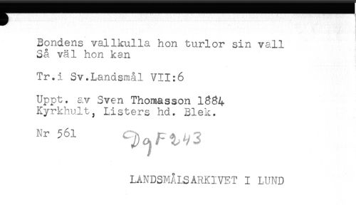 //// ! //// < //// ^ ' * J //// , ' * ' - ' ! //// Bondens vallkulla hon turlor sin vall //// Så väl hon kan //// Tr.i Sv.Landsmål VII:6 //// Uppt. av Sven Thomasson 1334 //// Kyrkhult, Listers hd. Blek. //// LANDSMÅLSARKIVET I LUND ////