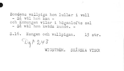 //// Bondens vallpiga hon lullar i vall //// - Så väl hon kan - //// och Konungen vilar i höganlofts sal //// - Så väl hon kväda kunde. - //// S.16. Kungen och vallpigan. 1$ str. //// ^^ a, v 2 //// WIGSTREH. SKÅNSKA VISCR ////