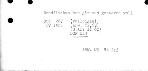 //// Bondflickan hon går med getterna vall //// # Sid. 287 (Vallpigan) //// 29 str. (Arw. 62,63) //// (G.Afz II 60) //// DGF 243 //// t //// g //// j //// ARW. MS Vs 2;3 ////