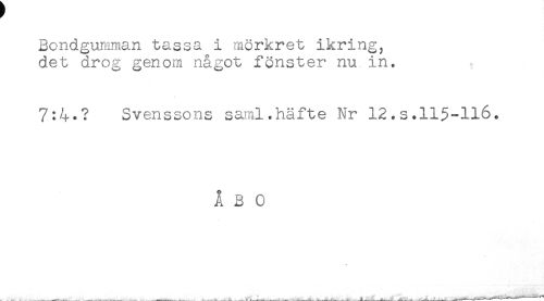 //// Bondgumman tassa i mörkret ikring, //// det drog genom något fönster nu in. //// 7:4.? Svenssons saml.häfte Nr 12.s.115-116. //// ÅBO ////