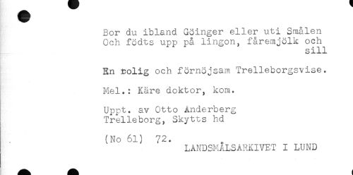 //// Bor du ibland Göinger eller uti Smålen //// Och födts upp på lingon, fåremjölk och //// sill //// En tolig och förnöjsam Trelleborgsvise. //// Mel.: Käre doktor, kom. //// Uppt. av Otto Anderberg //// Trelleborg, Skytts hd //// (No 61) 72. //// LANDSMALSARKIVET I LUND ////