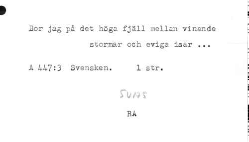//// Bor jag på det höga fjäll mellan vinande [ //// stormar och eviga isar ... //// A 447:3 Svensken. 1 str. [ //// - //// RA I //// * ////