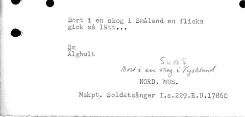 //// Bort i en skog i Småland en flicka //// ^^ gick så lätt... //// Sm //// Älghult //// NORD. MUS. //// Mskpt. Soidatsånger I.S.229.E.U.17860 ////