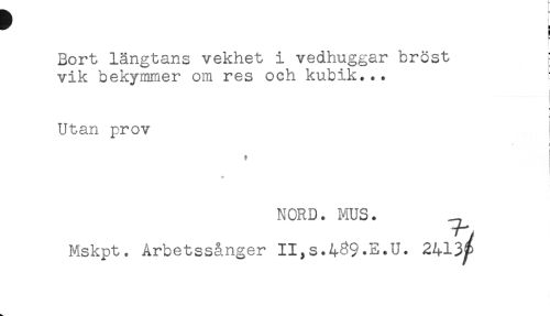 //// Bort längtans vekhet i vedhuggar bröst //// vik bekymmer om res och kubik... //// r //// Utan prov i //// t //// i //// * //// * //// NORD. MUS. ^ //// Mskpt. Arbetssånger II,s.489.E.U. 2413^ ////