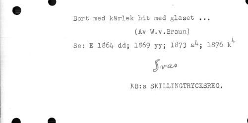 //// Bort med kärlek hit med glaset ... //// (Av W.v.Braun) //// Se: E 1364 dd; 1369 yy; 13?3 a^; 1376 k^ //// Jir^ //// KB:s SKILLINGTRYCKSREG. ////