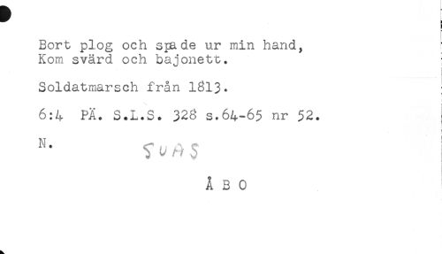 //// ! //// Bort plog och spade ur min hand, //// Kom svärd och bajonett. - //// Soldatmarsch från 1813. //// 6:4 PÄ. S.L.S. 328 s.64-65 nr 52. //// t //// N- f 3 //// ÅBO ////