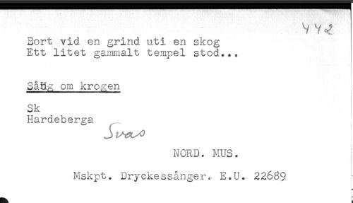 //// Bort vid en grind uti en skog //// Ett litet gammalt tempel stod... //// Så Hg, om krogen //// Sk //// Hardeberga //// NORD. MUS. //// Mskpt. Dryckessånger. E.U. 22689 //// t ////