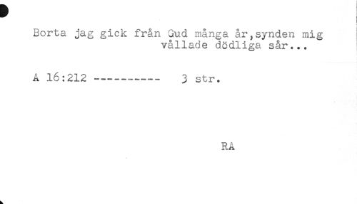 //// Borta jag gick från Gud många år,synden mig //// vållade dödliga sår... //// Å 16:212----- 3 str. //// RÅ ////
