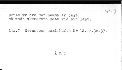 //// ^^' * ... ' * ^ //// Borta är bra men hemma är bäst, //// så sade nkomakarn satt vid sin läst. //// ! //// 4:4.? Svenssons saml.häfte Nr 12. s.36-37. //// t //// ! //// i //// ÅBO //// ! //// f ////