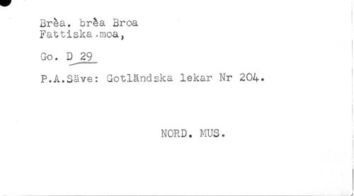 //// Bréa. bréa Broa //// Fattiska.moa, //// Go. D^ 29 //// P.Å.Säve: Gotländska lekar Nr 204. //// i //// ] //// ! //// * //// } //// t //// : //// i //// i //// NORD. MUS. //// t //// ____J ////