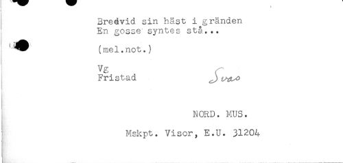 //// Bredvid sin häst i gränden //// ' En gosse syntes stå... //// (mel. not.) //// Vg ^ //// Fristad //// NORD. MUS. //// Mskpt. Visor, E.U. 31204 ////