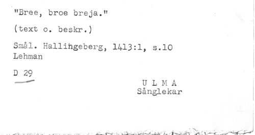//// ^ ^ 3 ^ ^ ^ j o. . * //// (text o. besltr.) j //// Smål. Hallihgeberg, 1413:1, s.10 //// Lehman //// < //// i //// ! //// t //// D 29 //// U L M A //// Sånglekar //// } //// < ////