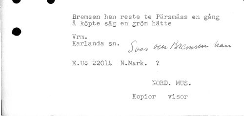 //// Bremsen han reste te Pärsmäss en gång //// å köpte säg en grön hätte //// Vrm. //// Karlanda sn. //// E.Uc 22014 N.Mark. ? //// : //// & //// I NORD. MUS. //// Kopior visor ////