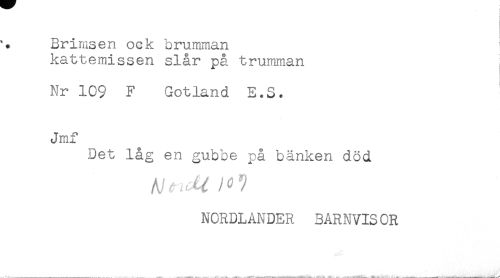 //// Brimsen ock brumman //// kattemissen slår på trumman //// Nr 109 F Gotland E.S. //// Jmf //// Det låg en gubbe på bänken död //// NORDLANDER 3ARNVIS0R ////