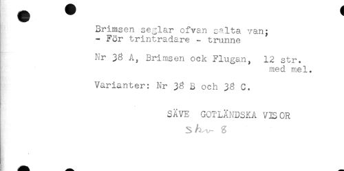 //// Brimsen seglar ofvan salta van; //// - För trintradare - trunne //// Nr 38 A, Brimsen ock Flugan, 12 str. //// med mel. //// Varianter: Nr 3g B och 3g C. //// SAVE GOTLÄNDSKA VIS OR //// sA^ % ////