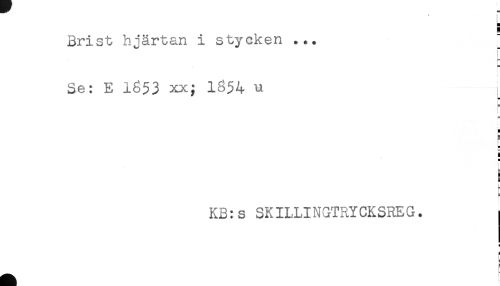 //// H //// Brist hjärtan i stycken ... [ //// Se: E 1653 xx; 1854 u . //// L— //// = //// f //// < //// H //// b //// ^ //// ] //// KB:s SKILLINGTRYCKSREG. ////