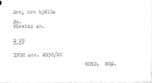 //// f //// Bro, bro bjälla //// t //// ! //// Ds. //// Vårviks sn. //// r //// D 29 //// < //// i //// IFGH Acc. 2953/20 //// NCRB. MUS. ////
