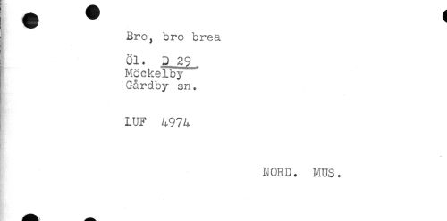 //// Bro, bro brea //// i Mockelby^ //// ! Gårdby sn. //// LUF 4974 //// NORD. MUS. ////