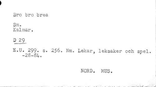 //// ! //// Bro bro brea //// Sm. //// Kalmar. //// D 29 //// ! //// E.U. 299. s. 256. Nm. Lekar, leksaker och spel. //// -23-34. //// ! //// NORD. MUS. //// . - . i .'t t , .. . r.. -^-tr ^ ////