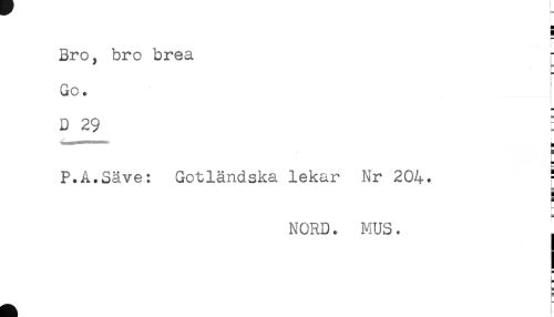 //// ] //// Bro, bro brea //// Go. //// D 29 //// P.A.Säve: Gotländska lekar Nr 204- - //// ] //// * //// NORD. MUS. //// [ //// — r ////