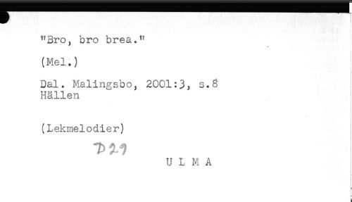 //// ) //// ^Bro, bro brea.^ //// t //// (Mel.) //// Dal. Malingsbo, 2001:3, s.3 //// Hällen //// ! //// (Lekmelodier) //// U L M A i //// - ////