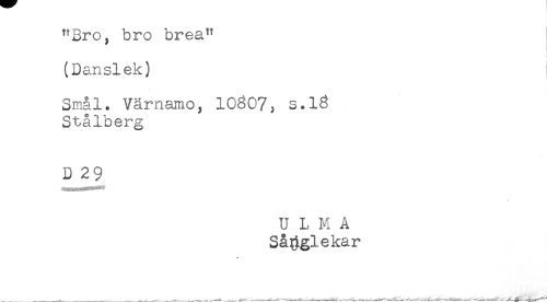 //// "Bro, bro brea" //// t //// i* //// (Danslek) //// Smål. Värnamo, 10807, s.l8 //// Stålberg //// D 29 //// U L M A //// Sånglekar ////