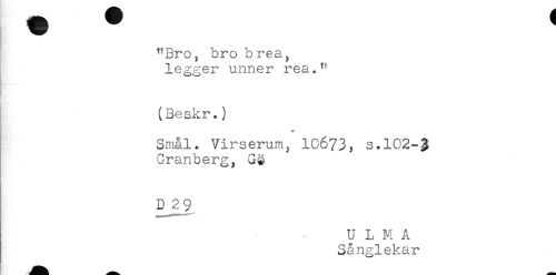 //// "Bro, bro b rea, //// legger unner rea." //// (Beskr.) //// * //// Smal. Virserum, 10673, s.102-^ //// Granberg, G$ //// D_29 //// ULMA //// Sånglekar ////