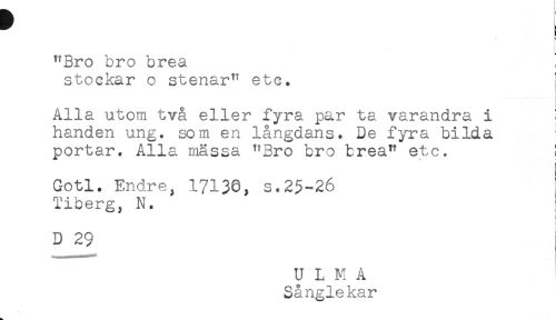 //// ) //// "Bro bro brea ! //// stockar o stenar" etc. i //// ! //// Alla utom två eller fyra par ta varandra i ! //// handen ung. som en långdans. De fyra bilda //// portar. Alla mässa "Bro bro brea" etc. ! //// Gotl. Endre, 17136, s.25-26 //// Tiberg, N. //// ; //// D 29 //// U L M A //// Sånglekar ////